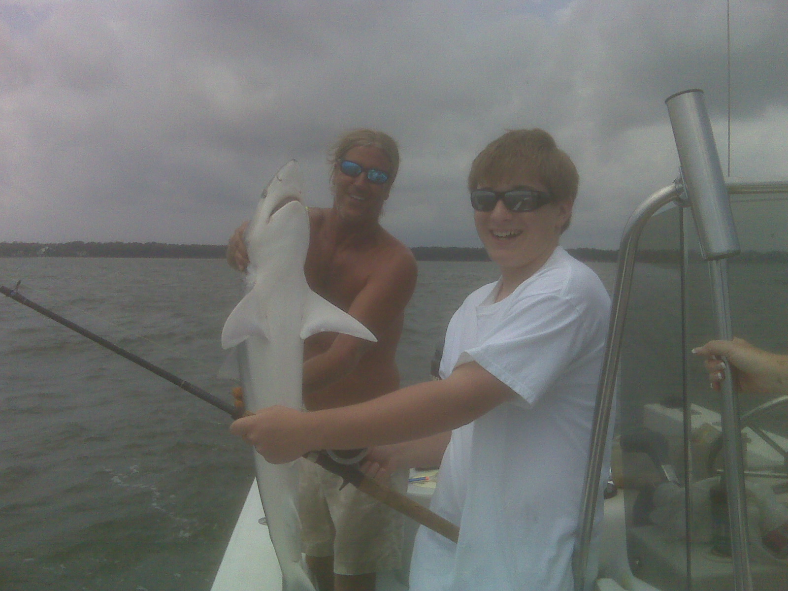 Finally a few years ago we went to Hilton Head and I booked a small fishing charter with Captain Dave Fleming of “The Mighty Mako” http://www.mightymako.com Dave was an affable guy and was wonderful with Janet and Jack as he said that the fishing was not too good but we could catch………..sharks!!! Now not far from where Jack and I swam in the bay the day before, we were reeling in baby shark after baby shark until Janets steel leader was bitten off by what Captain Dave described as a bull shark that we would not have wanted to bring in anyhow. Jack was thrilled and scared at the shark catch and Janet was amazed at how deftly Dave handled the sharks. Captain Dave suspected that I was a half assed fisherman so he let me bring in the smaller sharks and he took my picture as I held the first shark I had ever touched in a death grip on the back of his head. That was a good day fishing and we have not had much luck since.