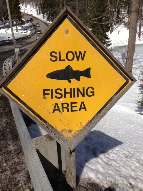 IMG00178photophoto Well, I have just sharpened and waxed all the skis to put away at the end of the season. It is April here in Pa. and although there is still snow in other areas, we are moving on here and I don’t have any ski trips left. Our local hill is closing this week and it is time to think spring. It is also time for a little self deprecation here as I tell some more stories of the 58 year old kid. When I think April, a number of thoughts come to my head but fishing seems to be the opener for the new round of posts. Now if you look at the picture above, my proficiency in the fishing world will be revealed by my question of ” where is the fast fishing area?” As I ponder this sign, I often wonder why people fish slowly versus quickly? Oh well, that will haunt me for a while as I begin my saga of my fishing experiences.