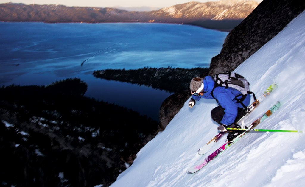 The second picture is of my friend Eric Durfee’s daughter Kress. Kress is shown here skiing down one of the steepest backcountry chutes in the Tahoe region. Her father tells me that on that particular day, the snow conditions were so sketchy and the terrain so steep that she did not want to make a turn and staight lined the chute to where she could finally make some turns to slow down. Kress was the National Collegiate Free Skiing Champion and a terror in the terrain parks with her twin tipped skis. I have known Kress all of her life and whenever I get a chance to ski with her, she is a pleasure to watch skiing warp speed with fluid turns and all the confidence in the world over some pretty steep and nasty terrain. Her father raced for Cornell back in the day and her older brother Travis was top ten west of the Mississippi for Downhill and Super G for many years as a member of the Far West Team. Travis was a national class ski racer and to this day, he says that Kress is the best skier in the family. That is saying something seeing that her other brother is a fantastic skier in the parks and her mother skis flawlessly down any run, at any area in Lake Tahoe. Kress is a vision on skis regardless of gender.