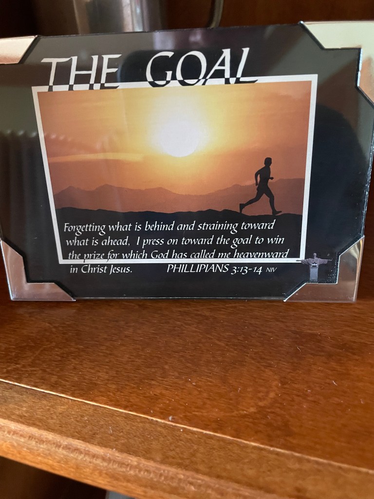 I listened to her and then suddenly she pulled this framed piece out of her purse and gave it to me. She said that Dan had always treasured it and looked at it every day during his suffering and treatments. She said it gave him peace that she could not quite understand. She also said ,incredibly, that it was the only thing that survived the fire by way of personal belongings. It was untouched and unscathed. She couldn’t believe it and wanted me to have it back because she knew how much it meant to me and to Dan and that I could remember him when I looked at it. As hard as life was for her, she became a believer, and now has moved on in her quest for her own prize.