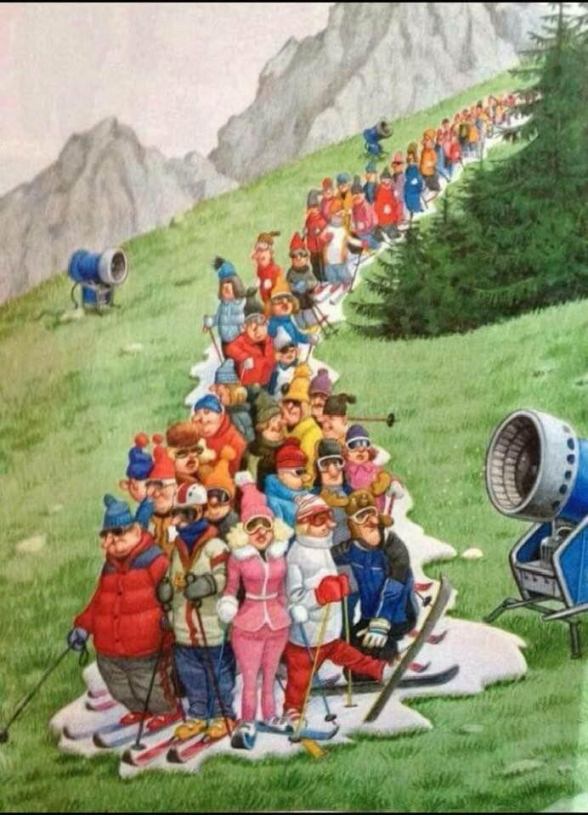 So, here we are. Anxiously awaiting another season. Hoping that the crowds are not as bad as the cartoon above, but so what!! I will be there – rain or shine, head on a swivel, happy to once again make those arcs in the snow. Thanks for reading and think snow.