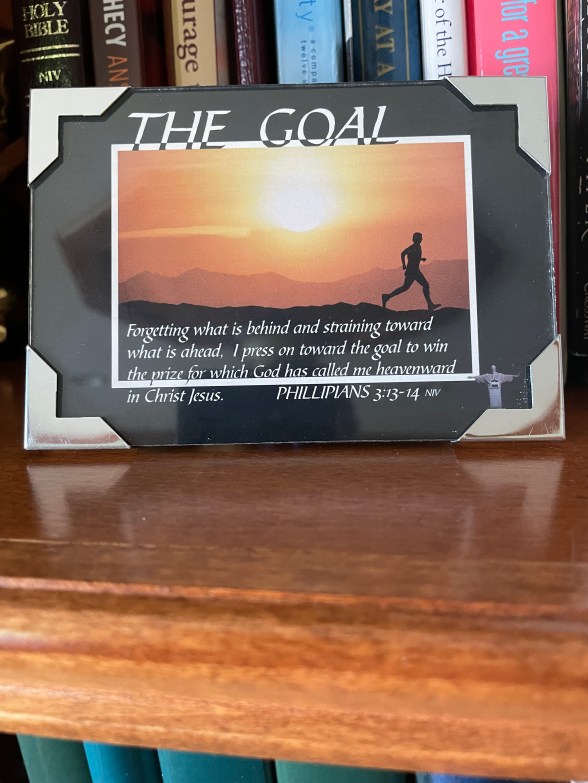 One day he took me aside and told me in confidence that he had been diagnosed with cancer. It was not good and he needed a friend in a very real way. I tried to be there for him and we had a lot of talks about the “what ifs” and how his wife and family would be affected. As his case was pretty terminal, I felt the need to share my faith with him to explain the Good News and that there was a better world waiting for him if he was willing to believe. I gave him a very treasured picture in a little silver frame that my wife Janet had given to me. It was a picture of a runner with the verse from Paul’s letter to the Phillipians. Phillipians 3 verses 13-14 which talks about running the race and seeking the prize in Christ Jesus. You can see it above and below. I treasured this piece because it was from Janet and featured a scripture that referenced running. I gave it to Danny and told him the story about how Janet had given it to me. He was touched and appreciated the gesture and took it home as a reminder to stay the course and trust the Lord in all things – even with this very grim diagnosis.