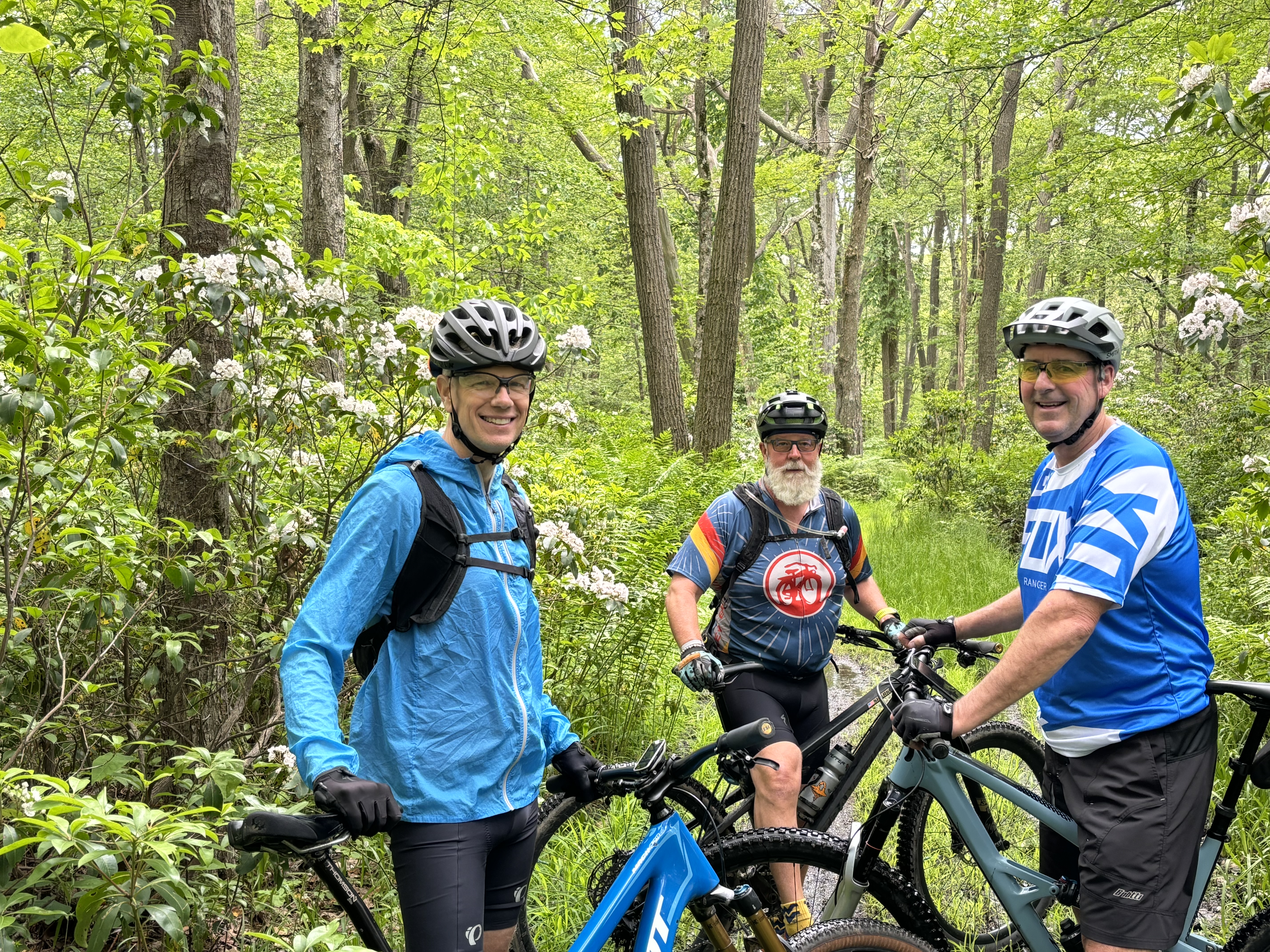 Pete Hilton, Shark, and Roger Evans taking in Laurel Mountain Trails on Friday