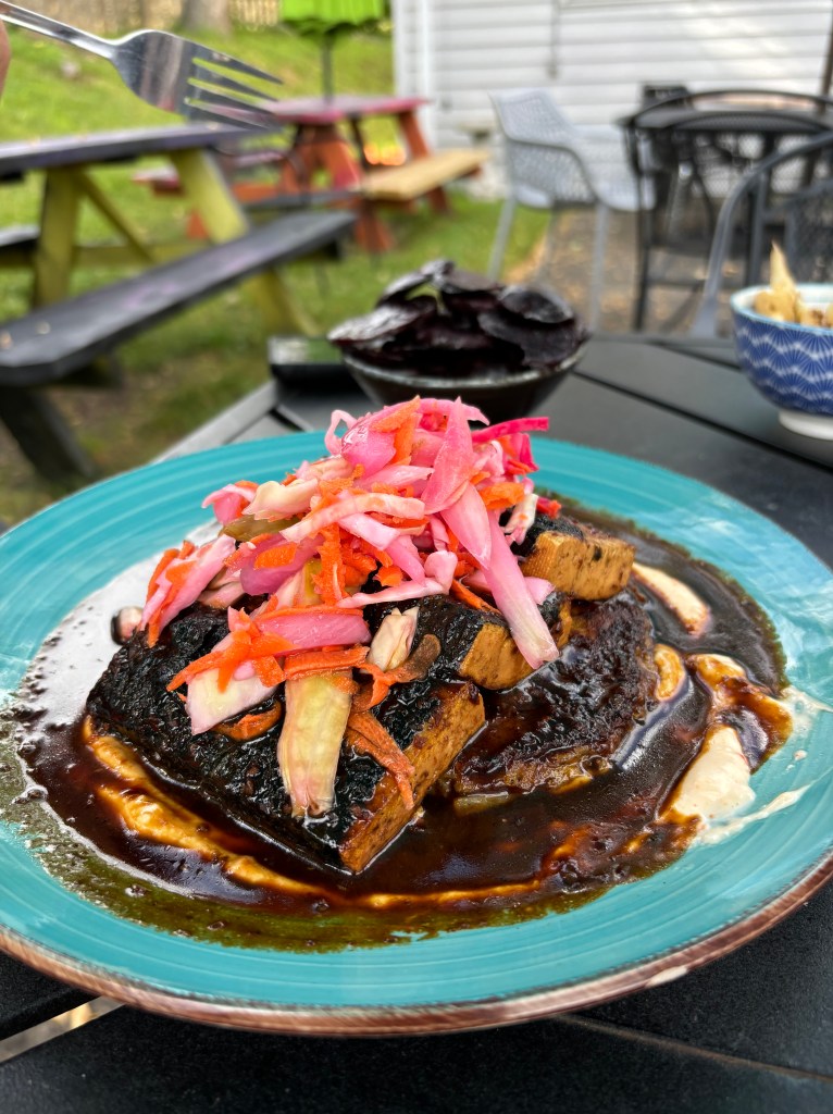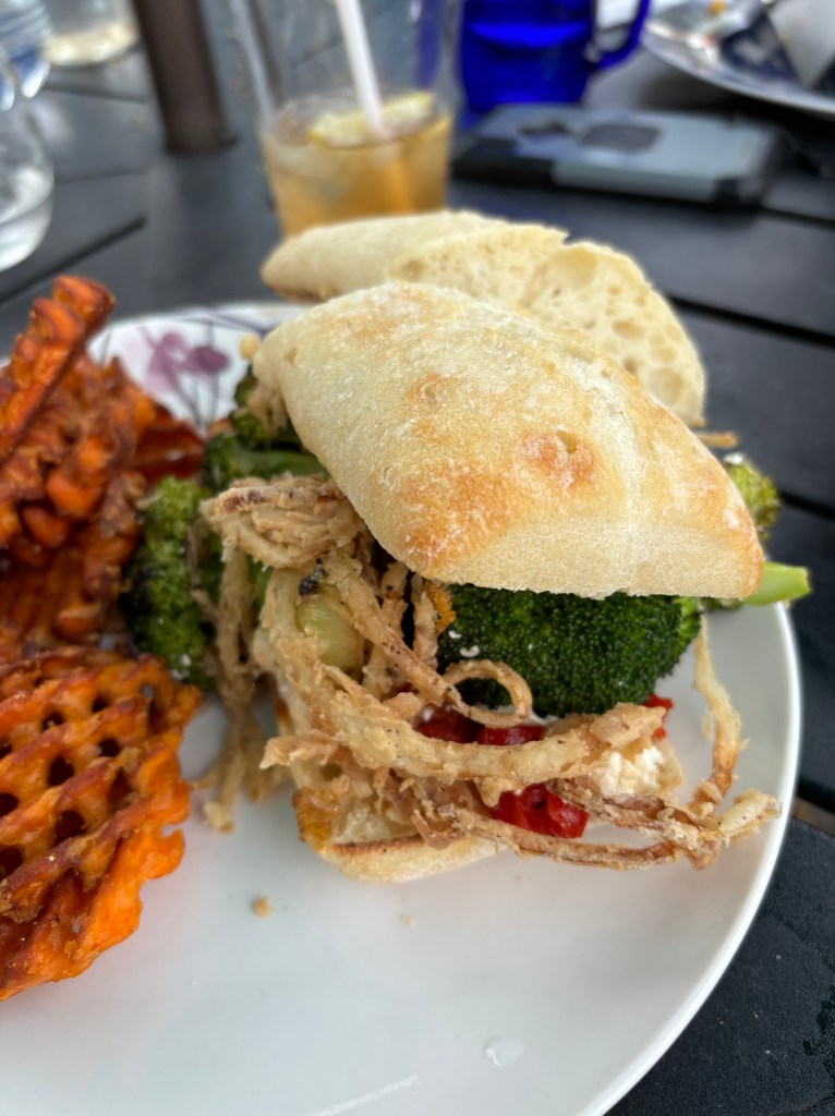 The Fat Squirrel does not disappoint. Japanese Tofu pancakes with cabbage and radish garnish finished with a real tasty sauceVegetable sandwich with onion straws and sweet potato fries. Yum!