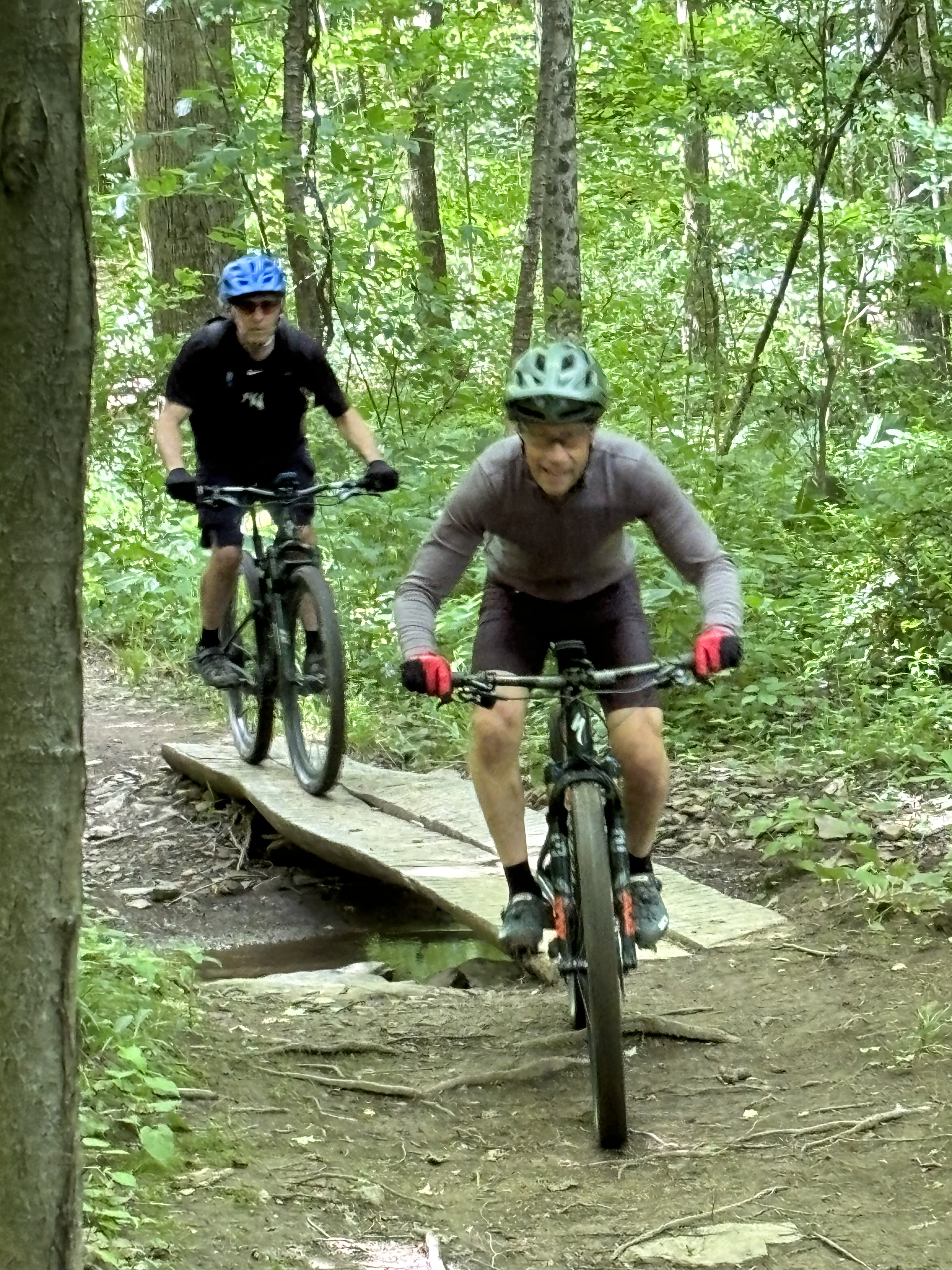 Take my friend Jeff Chetlin, for instance. Now I have posted about Jeff and his lovely wife Julie before but as a refresher, Jeff had a stroke a couple of years ago that could have been devastating in consequence. Jeff was having a routine heart valve replacement and produced a clot on the operating table and had a stroke. His recovery was slow and steady, but Jeff always had a positive and a “can-do” attitude which helped his recovery over the last couple of years. I remember his first mountain bike ride after the stroke down at the Bowling Green area of Frick Park. He was a bit apprehensive but wanted to do it and I remember telling him- ” you know how to ride a bike, just get on and peddle.” Which is what he did with a big smile on his face. Fast forward a couple of years and here he is this weekend riding all the trails at our North Park with very little trouble at all. Jeff has always been a “go getter” guy and his attitude towards his recovery has been exemplary. Although he admits that he is not back to where he once was before he had the stroke, he is grateful that he can ski at his home area of Mt. Bachelor, Oregon. He makes beautiful turns- I was witness to that last winter. He also has been riding the trail systems in Bend with no issue.